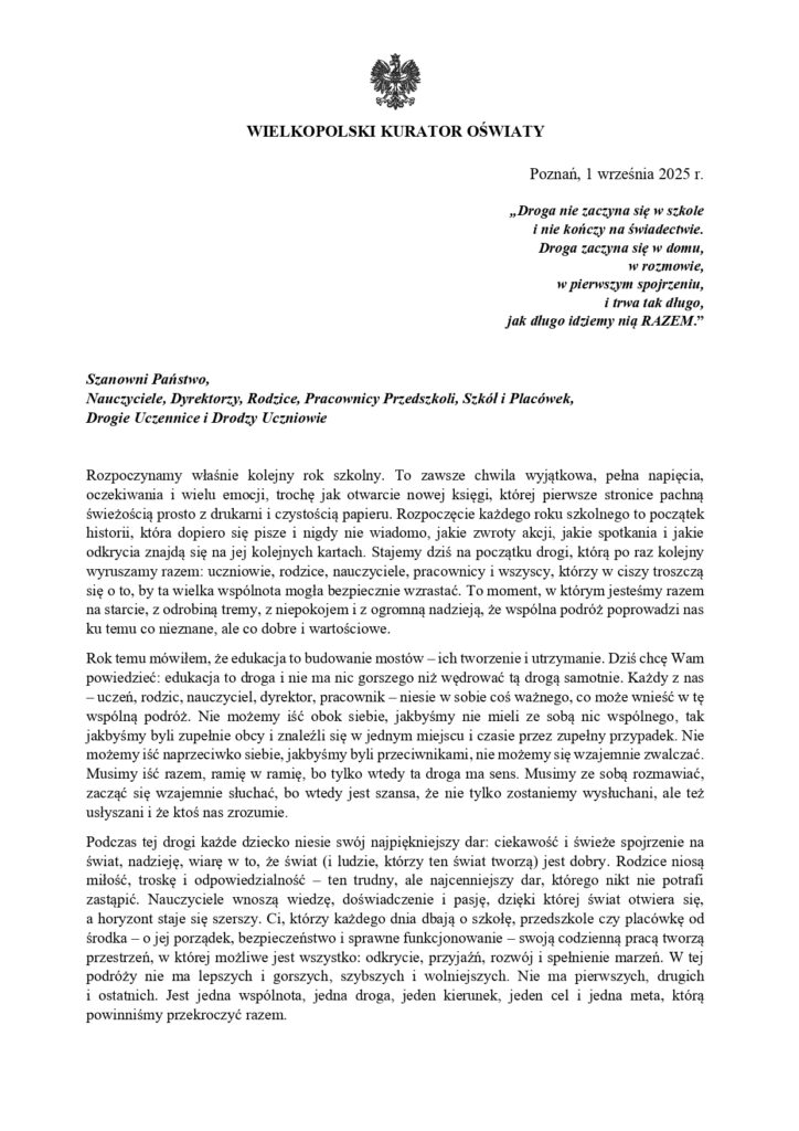 LIST WIELKOPOLSKIEGO KURATORA OŚWIATY NA ROZPOCZĘCIE NOWEGO ROKU SZKOLNEGO. Nawigacja wpisu « UKS ZDUNYInformacja o bezpłatnym programie leczenia otyłości u dzieci i młodzieży z Wielkopolski. »