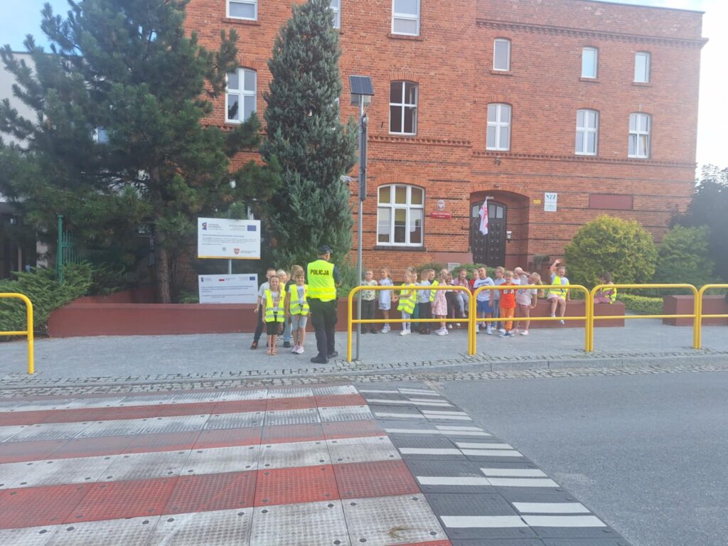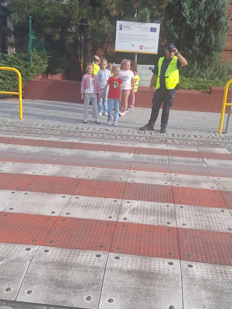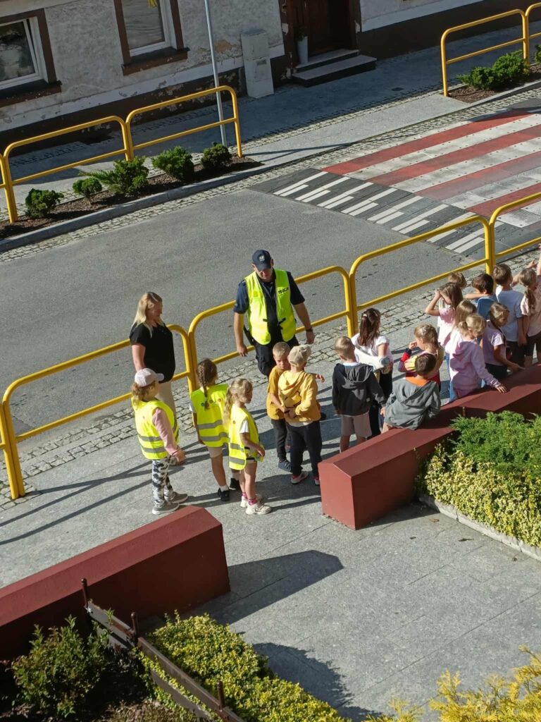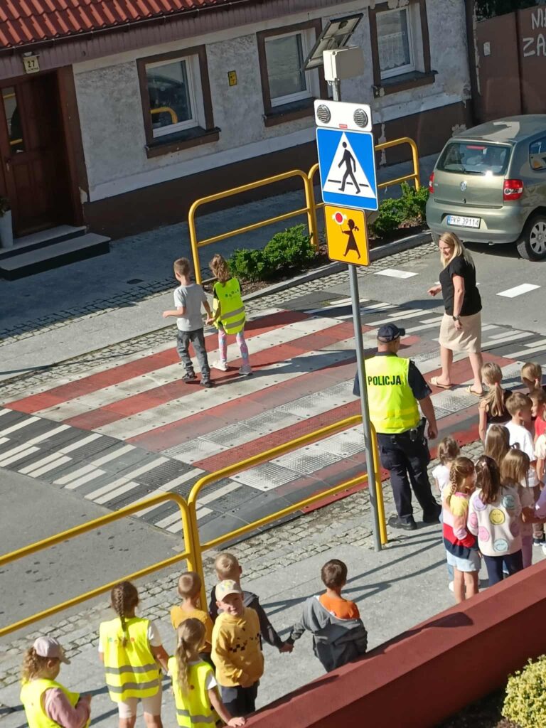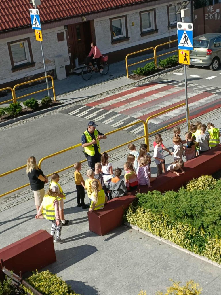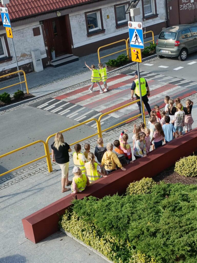 Po części teoretycznej 📖 odbyły się zajęcia praktyczne. Uczniowie ćwiczyli przechodzenie przez jezdnię na przejściu dla pieszych 🛑 oraz utrwalali znajomość podstawowych znaków drogowych 🚏. Spotkanie było bardzo ciekawe i pouczające ⭐.