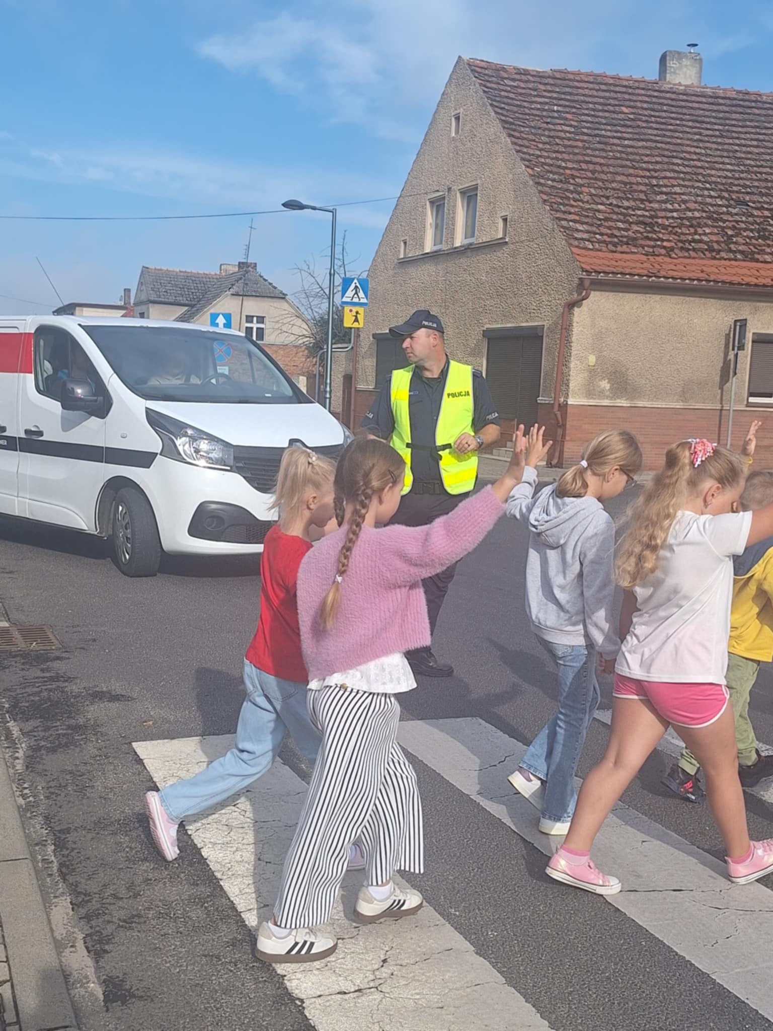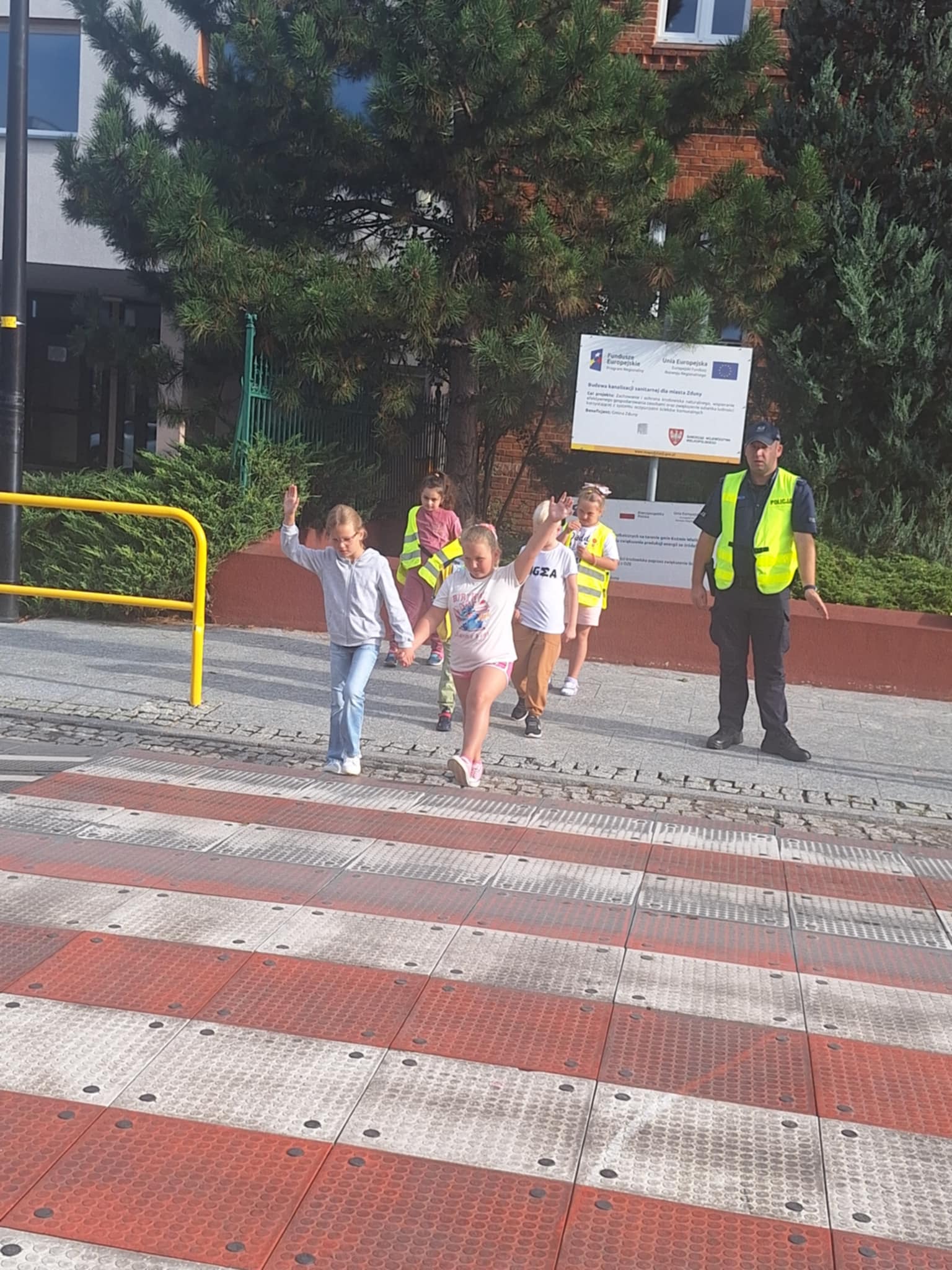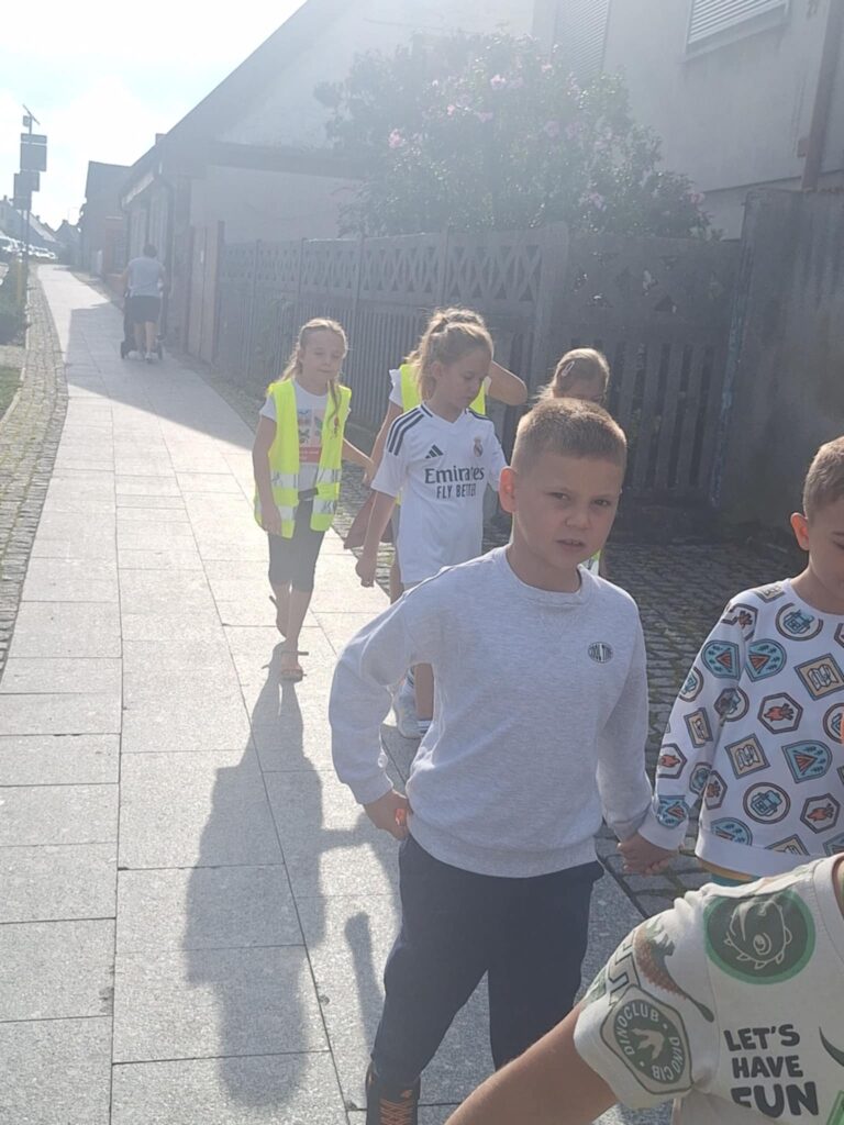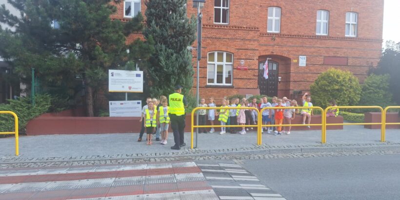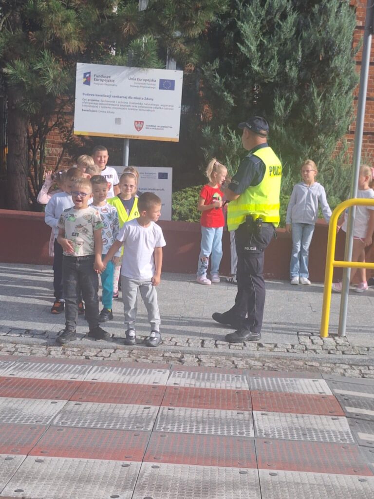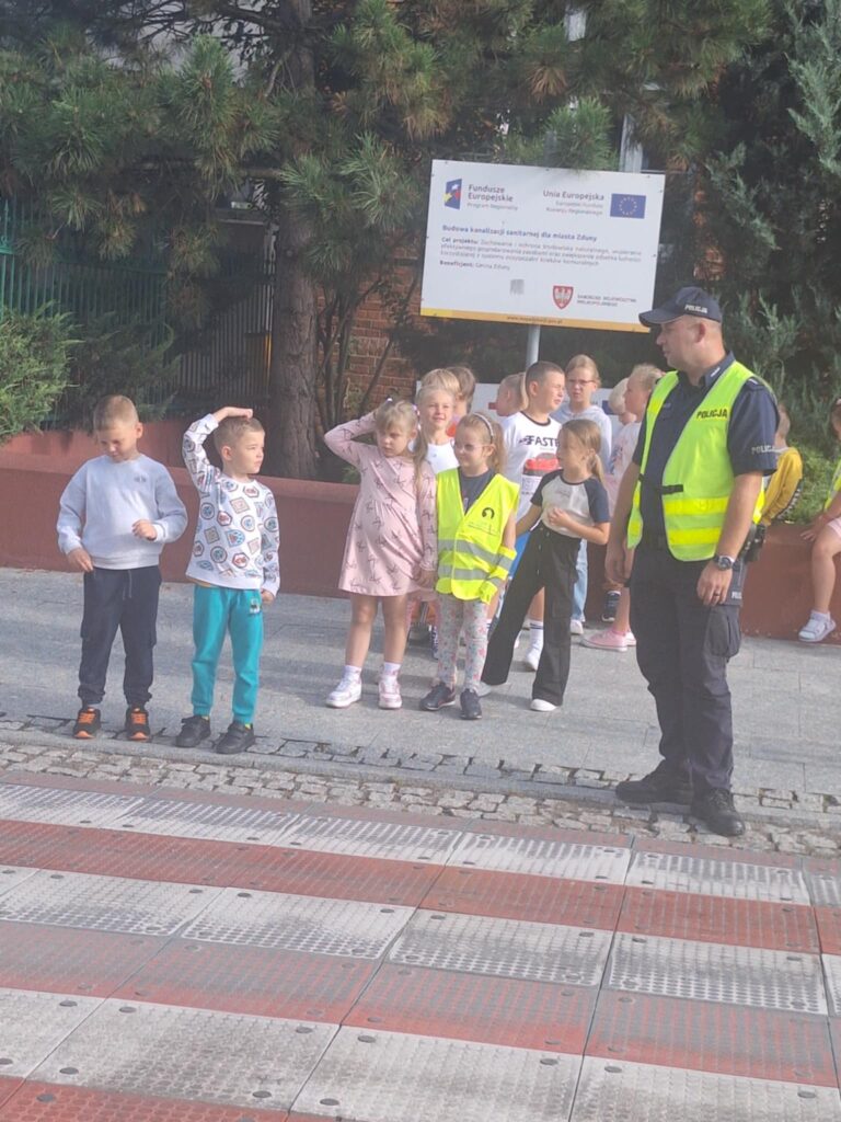 Po części teoretycznej 📖 odbyły się zajęcia praktyczne. Uczniowie ćwiczyli przechodzenie przez jezdnię na przejściu dla pieszych 🛑 oraz utrwalali znajomość podstawowych znaków drogowych 🚏. Spotkanie było bardzo ciekawe i pouczające ⭐.
