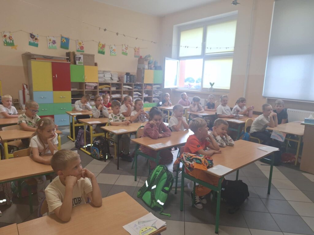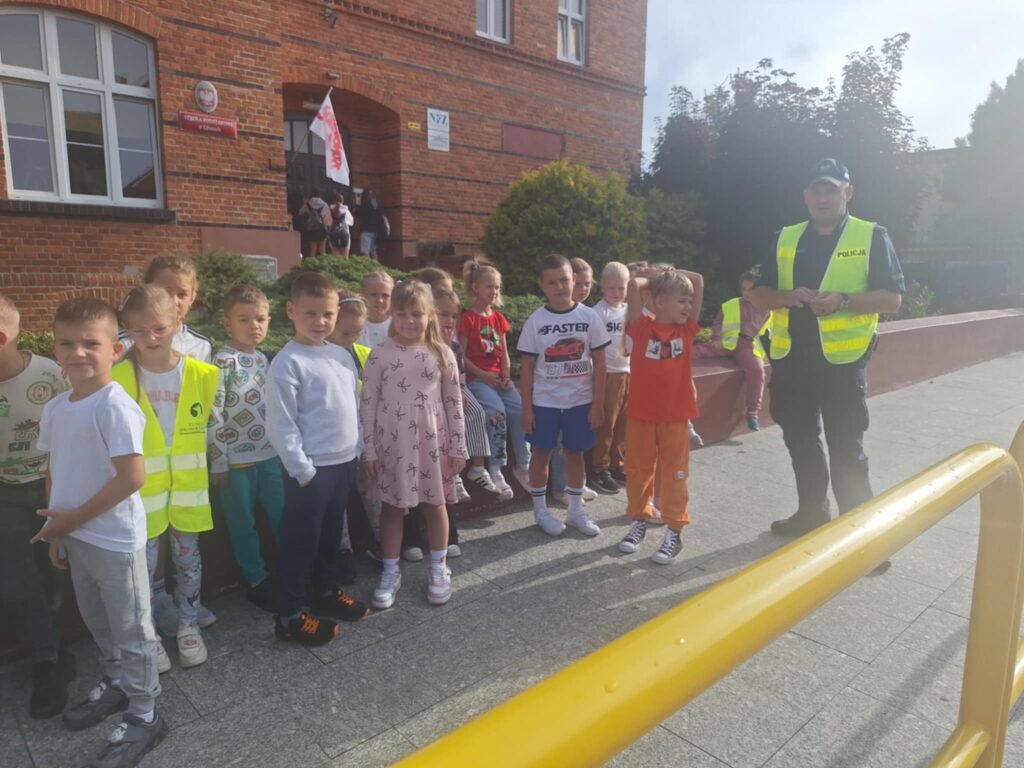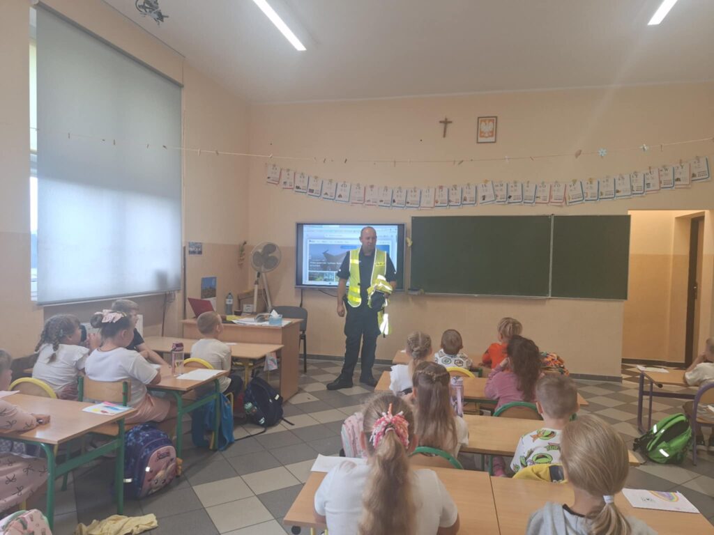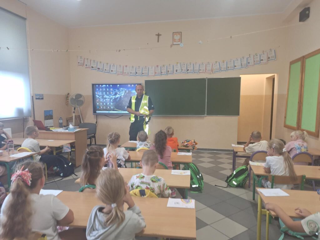 Dzisiaj uczniowie klas pierwszych uczestniczyli w spotkaniu z panem dzielnicowym Pawłem Tkaczem, który przeprowadził pogadankę na temat bezpieczeństwa w ruchu drogowym 🚦🚗. Dzieci dowiedziały się, jak