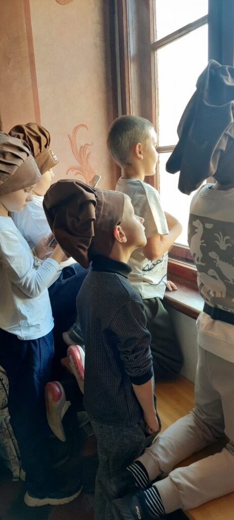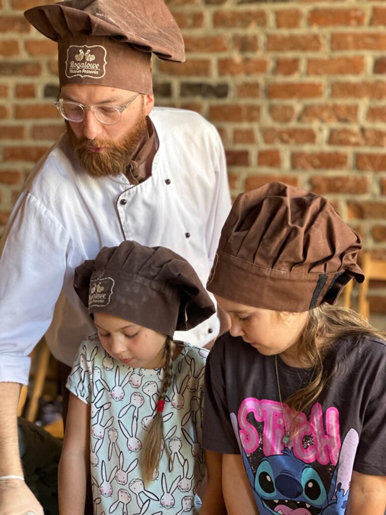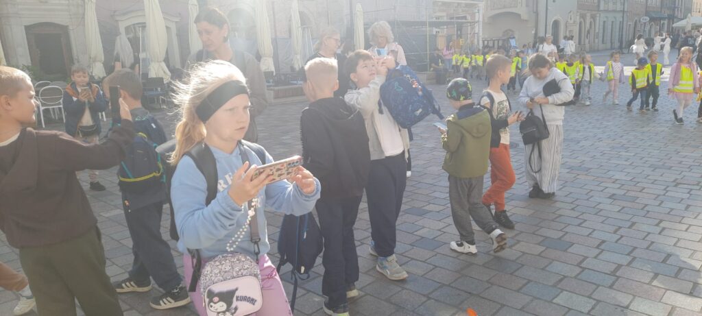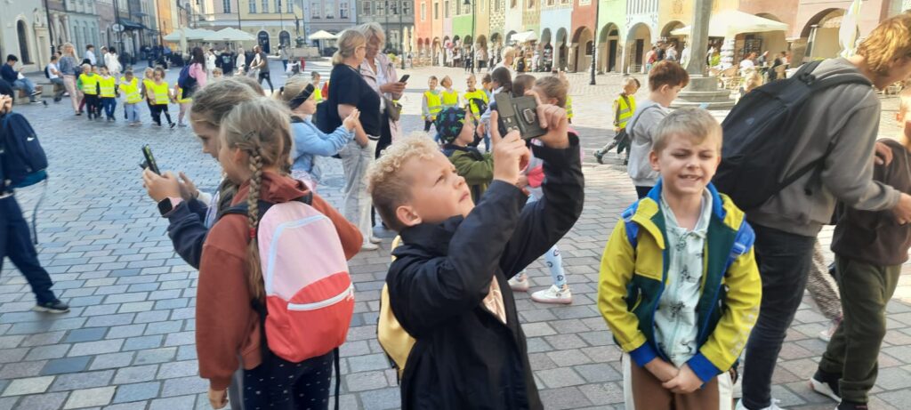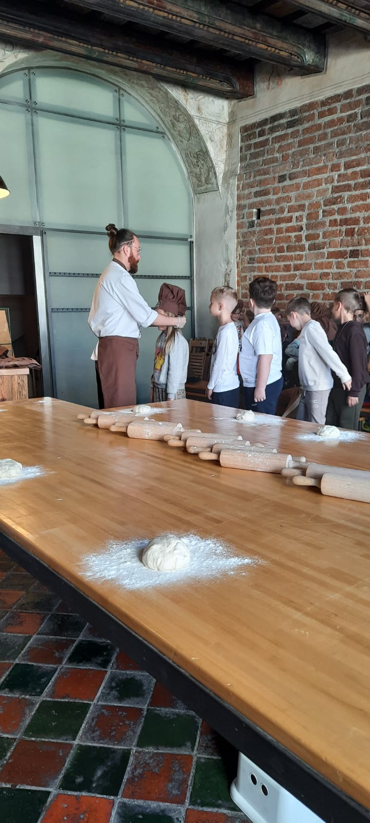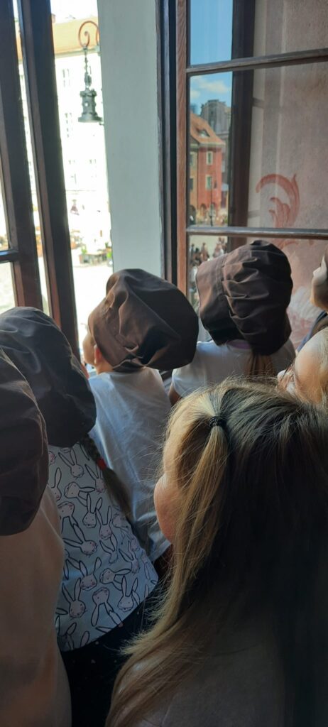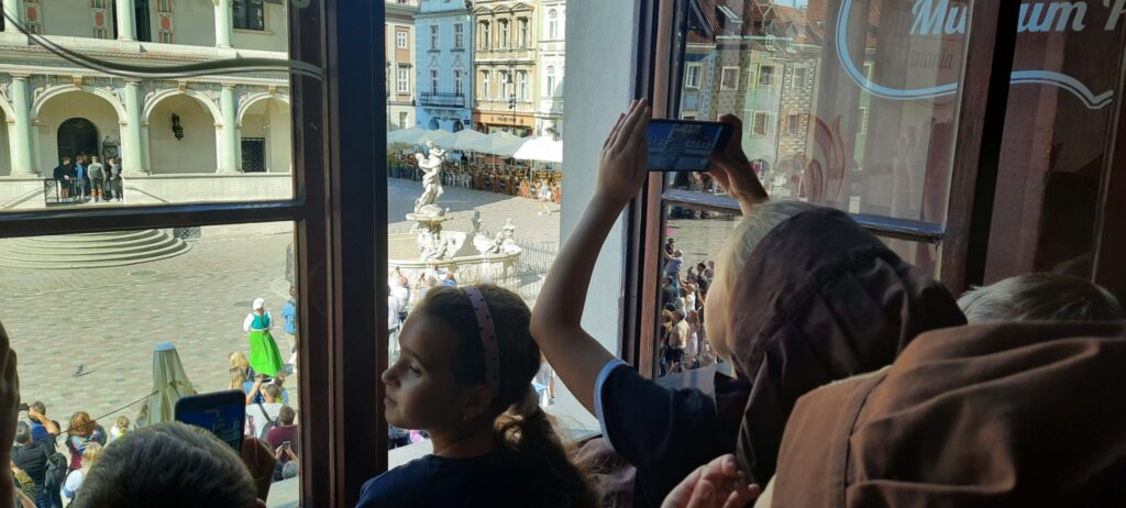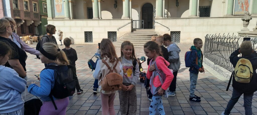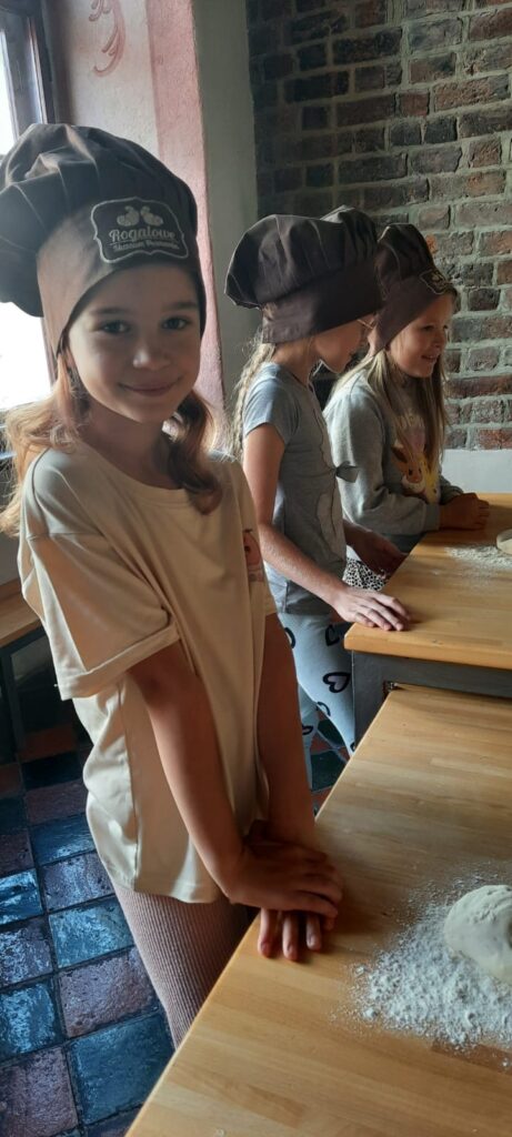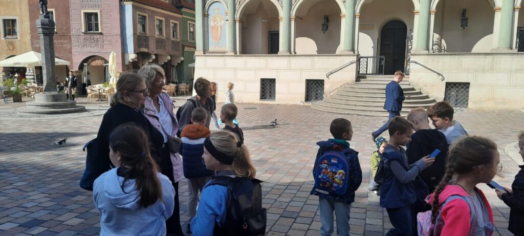 Pierwszym punktem programu było Muzeum Rogalowe, gdzie uczniowie mieli okazję zapoznać się z historią słynnego poznańskiego rogala i tradycją jego wypieku. Dzieci uczestniczyły w warsztatach, podczas których samodzielnie piekły te pyszne, maślane wypieki. Smakowite rogale, które udało im się przygotować, zostały później podzielone i wspólnie degustowane. Punktualnie o godzinie 12.00 z okien muzeum uczniowie obserwowali słynne poznańskie koziołki – symbol miasta, które codziennie o tej porze walczą ze sobą na wieży ratusza.