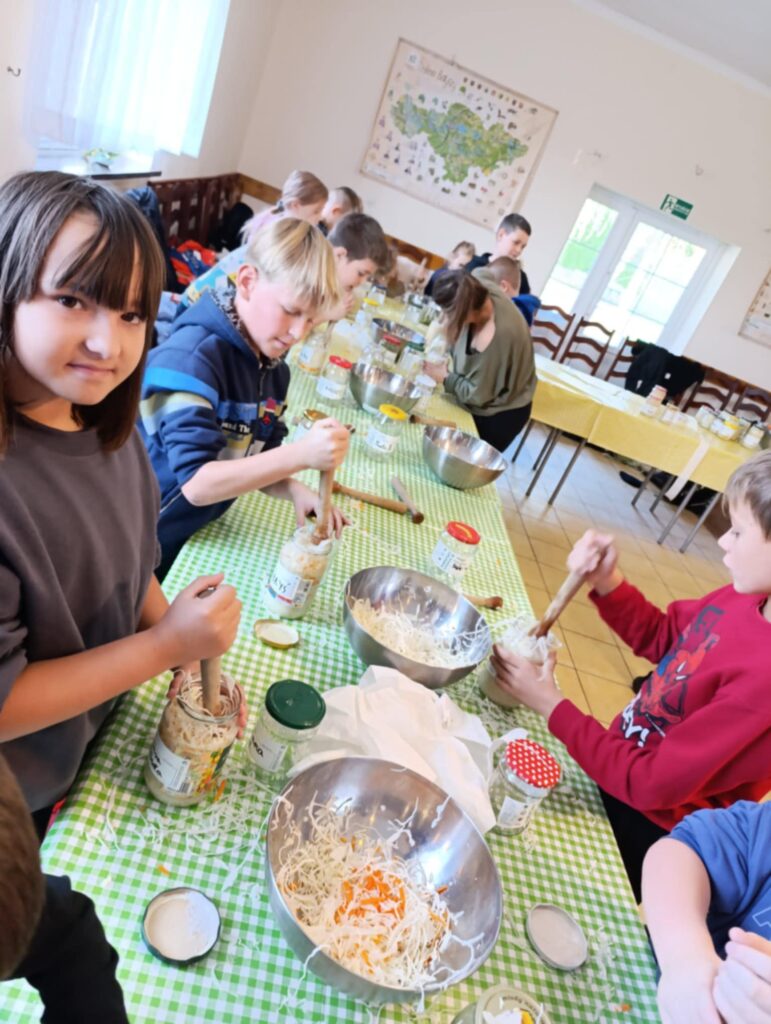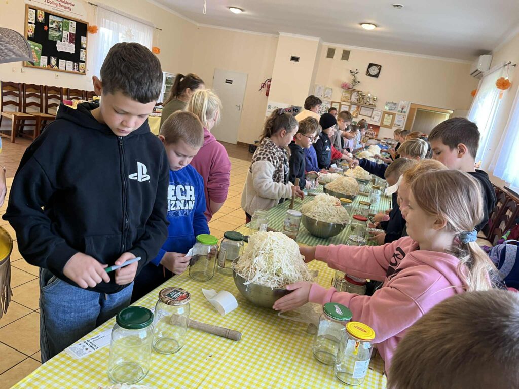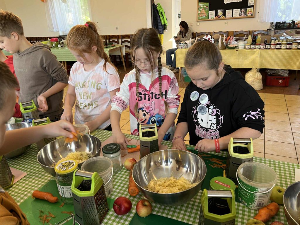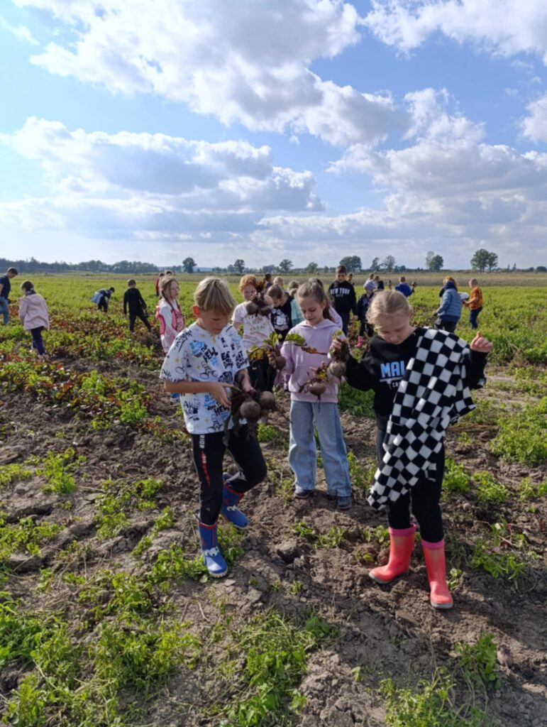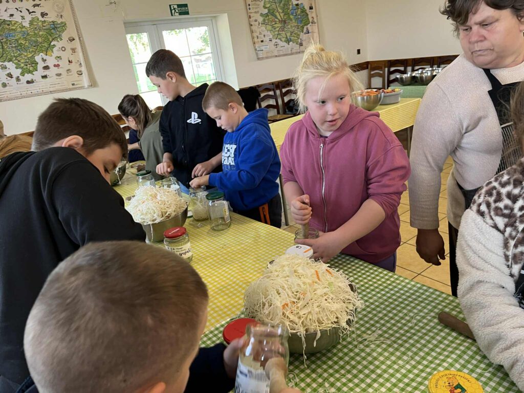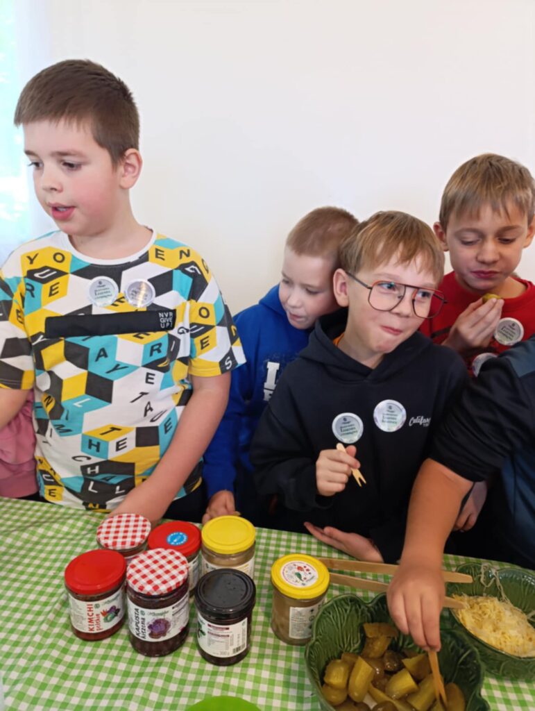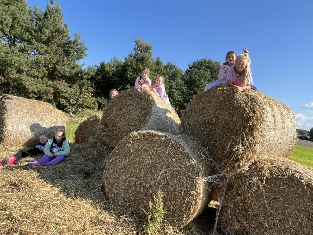 Uczniowie klasy 3a i 3b wybrali się na niezwykłą przygodę do Gospodarstwa Rolnego M. Sznajder w Karnicach. Program dnia obfitował w atrakcje – dzieci samodzielnie przygotowały słoiki z kiszoną kapustą, zrobiły surówkę i spróbowały kolorowych kiszonek. Ogromną frajdę sprawiło im także ognisko, podczas którego królowały pyry z gzikiem, swojska kiełbasa, chleb na zakwasie, masełko czosnkowe i aromatyczna herbata piernikowa. Uczniowie zwiedzili gospodarstwo oraz wzięli udział w wykopkach i samozbiorach – torby pełne ziemniaków i dorodnych buraków były najlepszą pamiątką z wycieczki. Nie zabrakło również zabaw na placu zabaw i odpoczynku na belach słomy. Na zakończenie każdy uczestnik otrzymał certyfikat „Kiszonkowego Masterszefa” oraz pamiątkowy warzywny tatuaż. Dzieci wróciły z wycieczki zmęczone, trochę ubrudzone, ale szczęśliwe i pełne nowych doświadczeń!