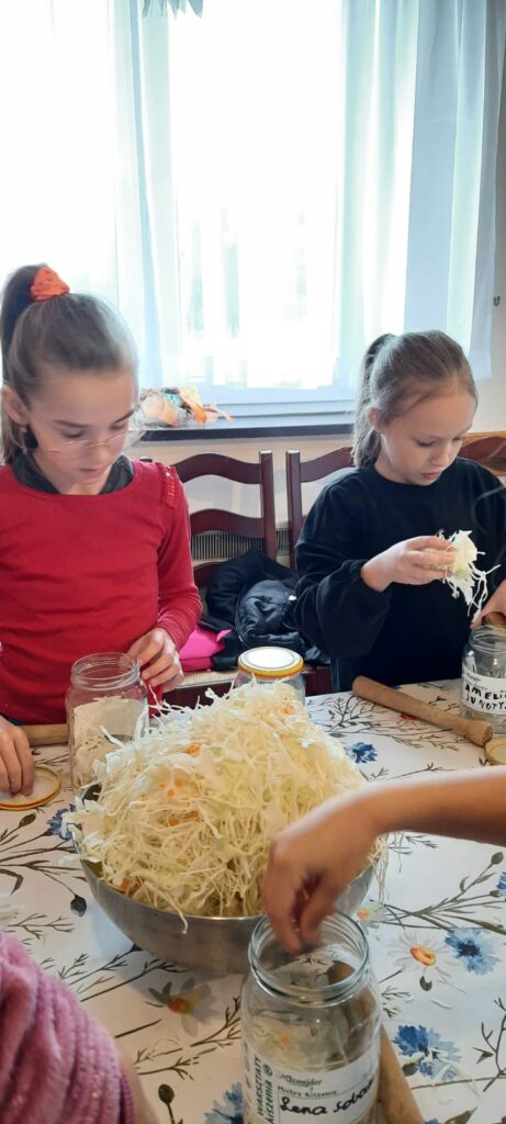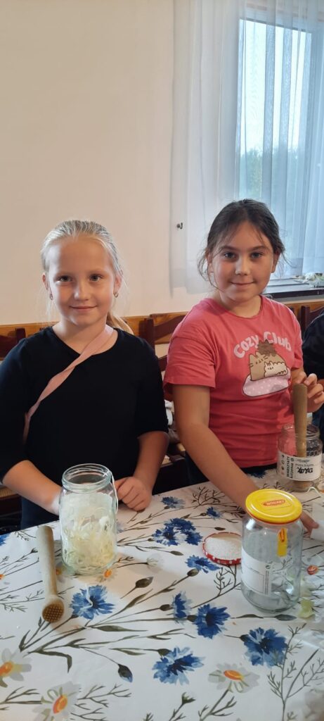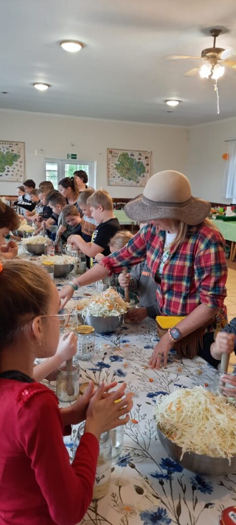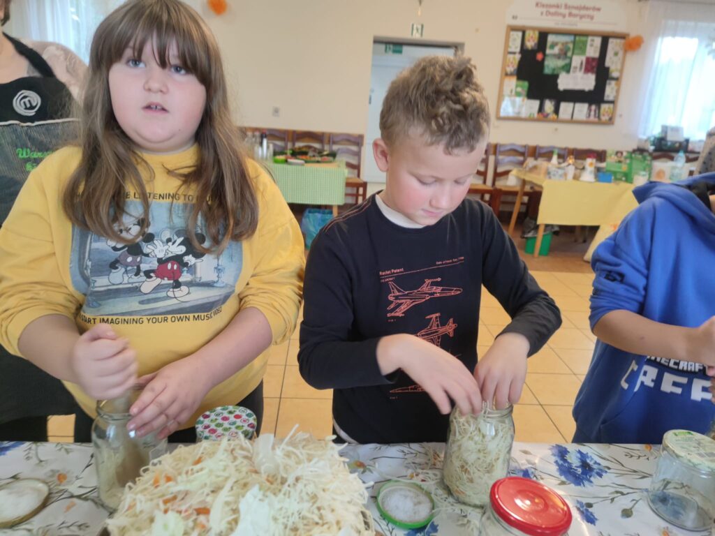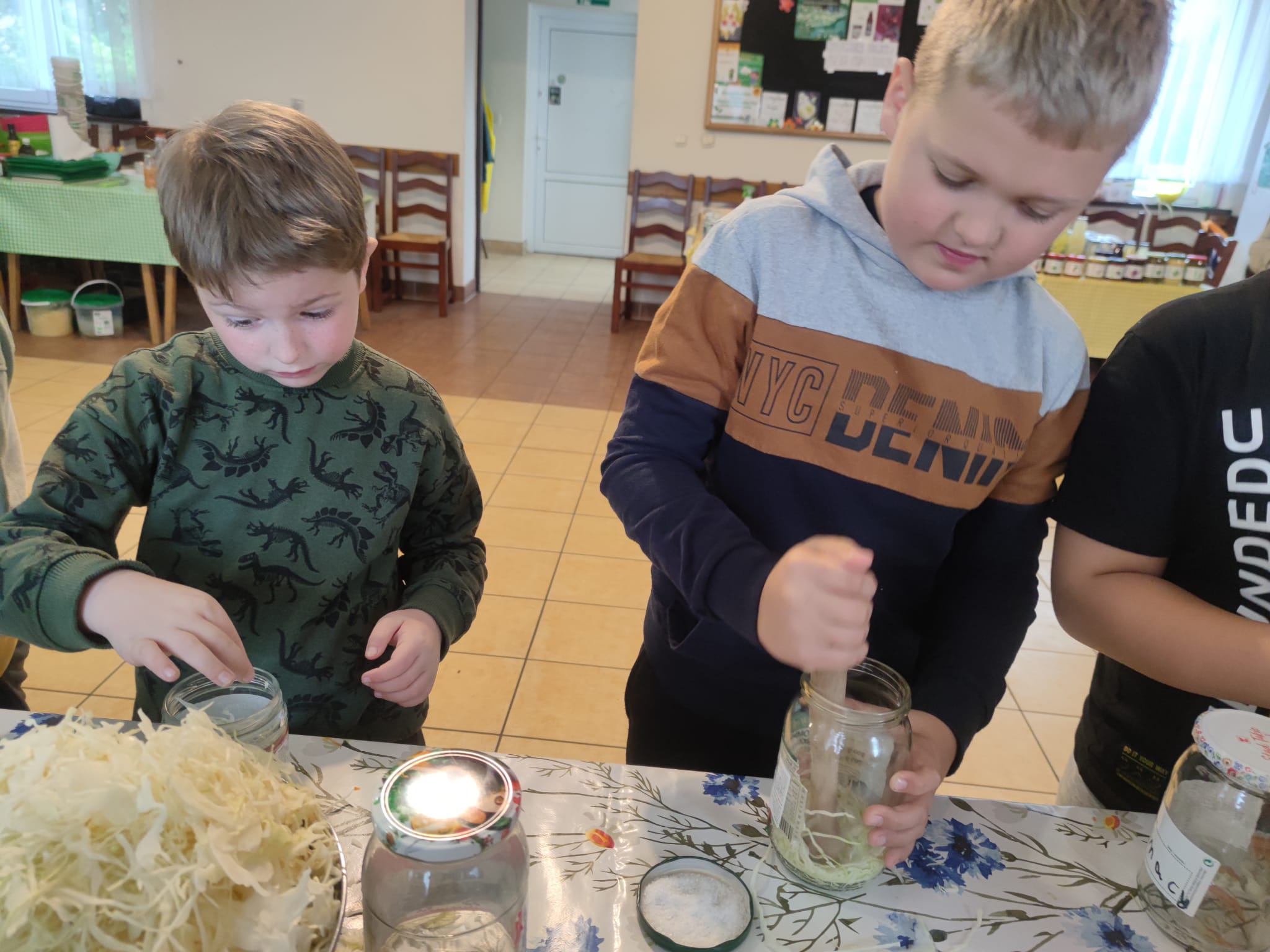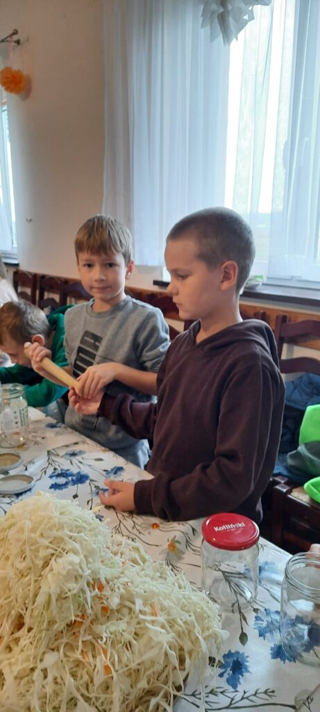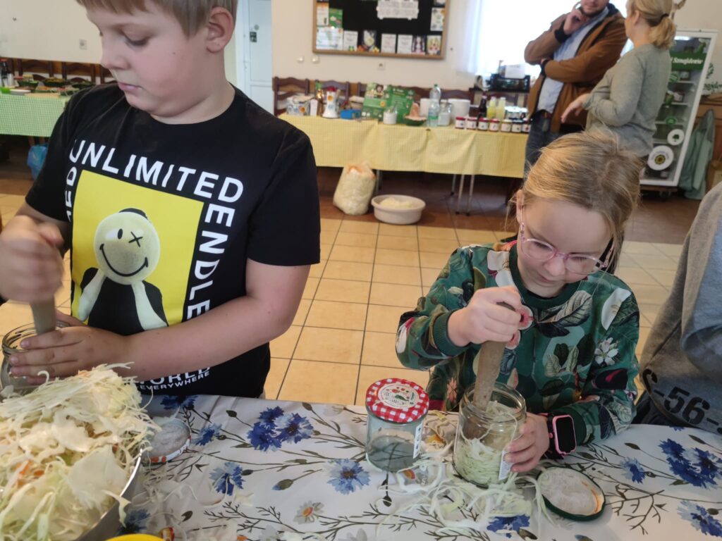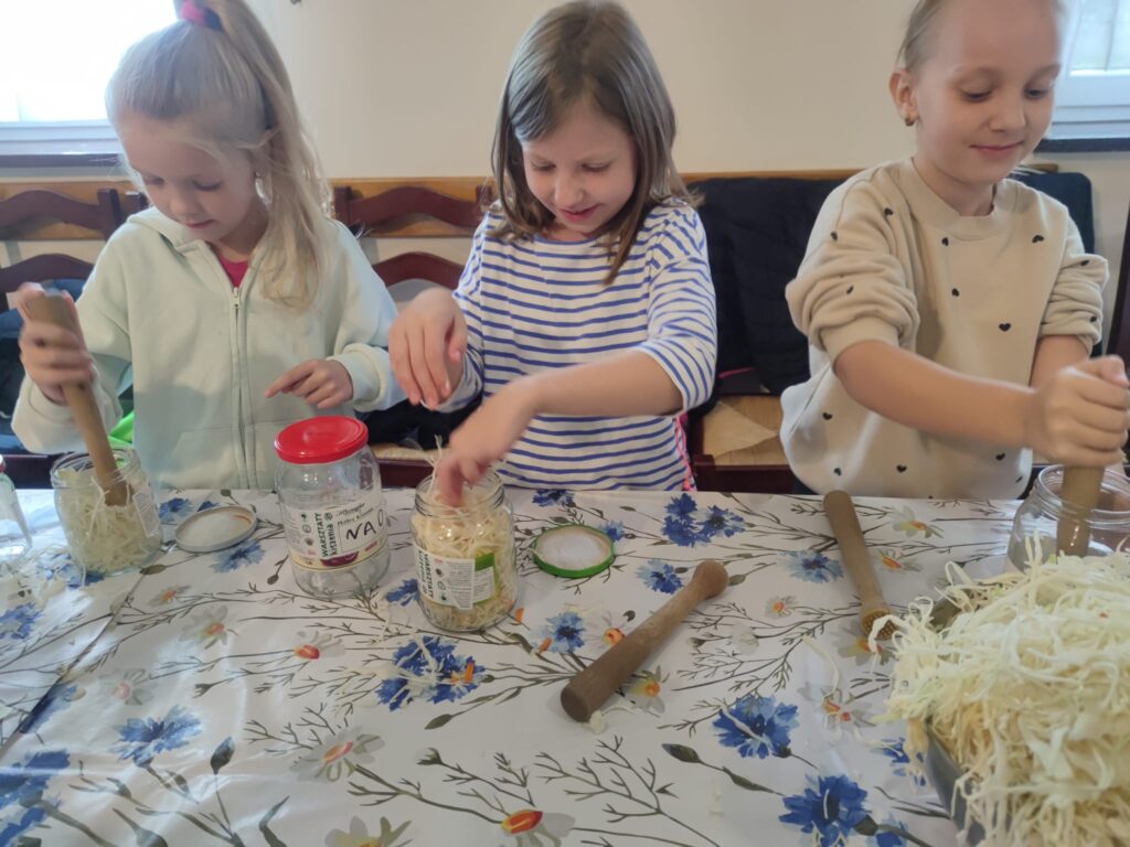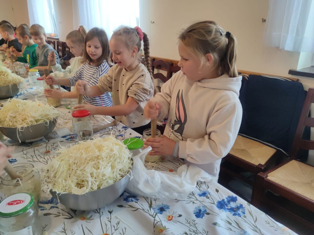 Uczniowie klas 2b i 2c uczestniczyli w niezwykłych warsztatach kiszenia kapusty u Emilii Sznajder w Karnicach. Dzieci miały okazję własnoręcznie kisić kapustę, poznając tradycyjne metody przygotowywania tego zdrowego przetworu. Degustowały również kiszone smakołyki – ogórki, rzodkiewki, czosnek, marchewkę i kalafiora – przekonując się, że zdrowe może być naprawdę pyszne!