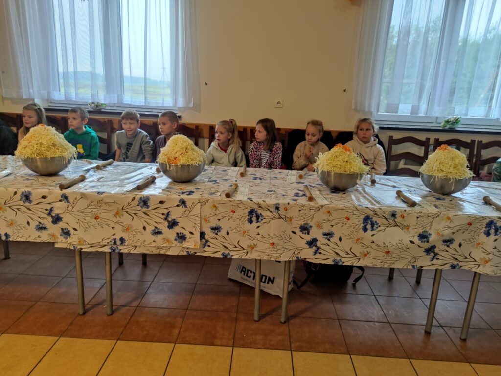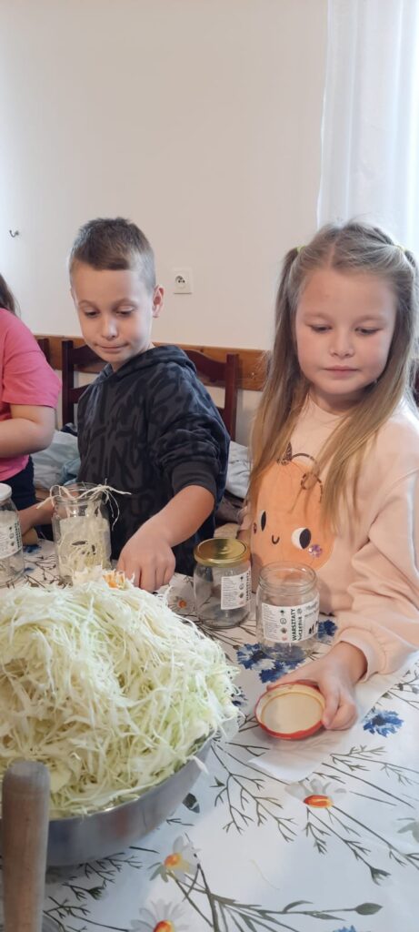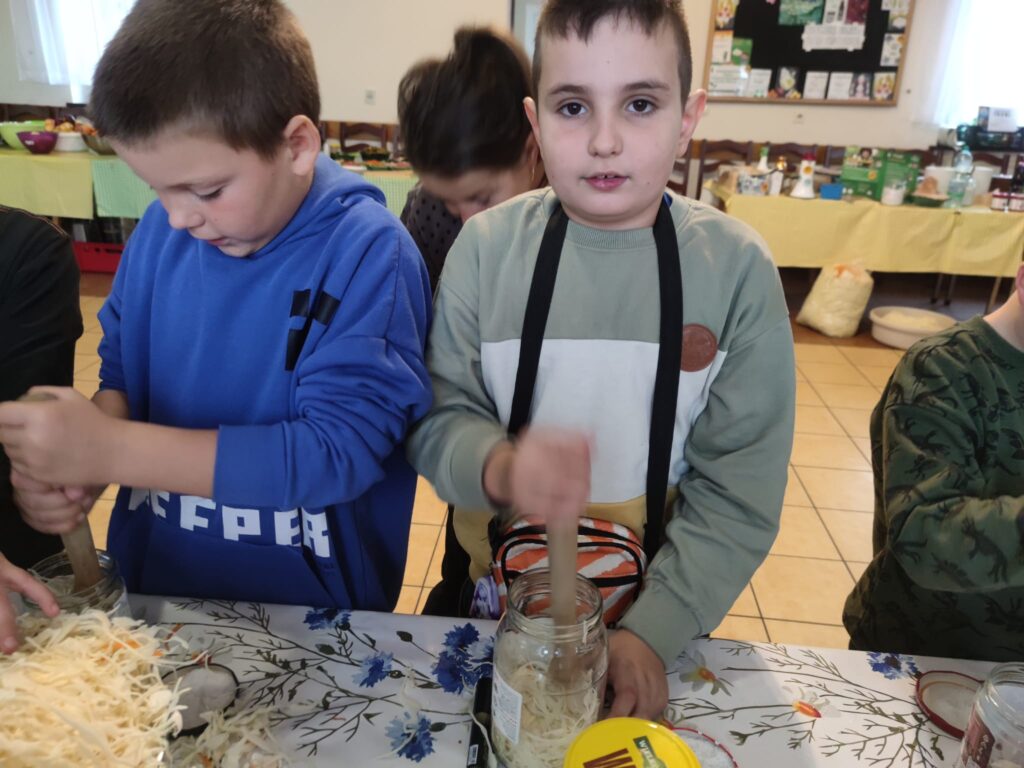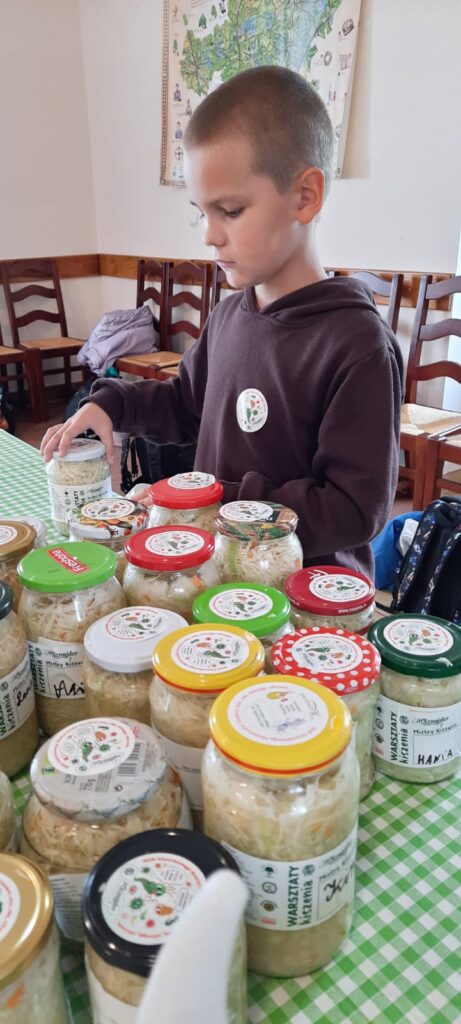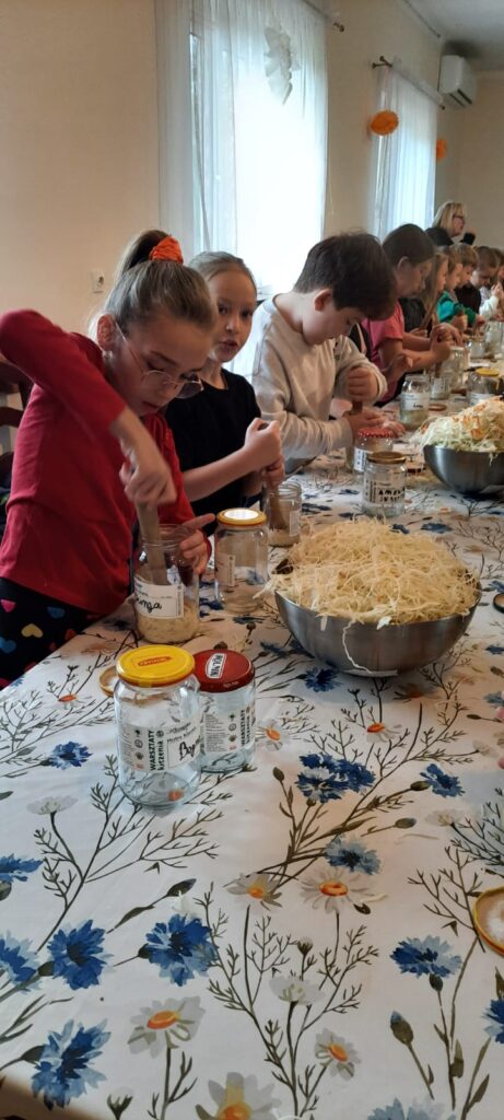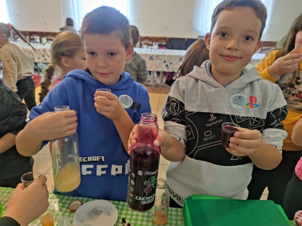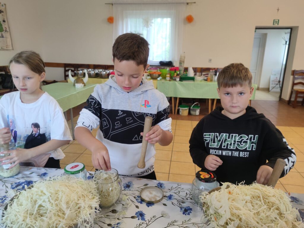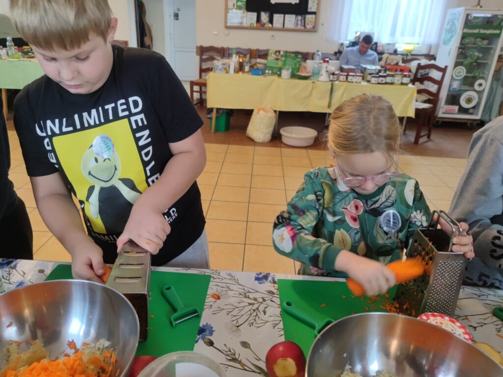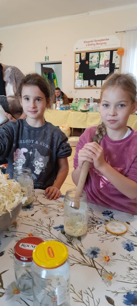 Uczniowie klas 2b i 2c uczestniczyli w niezwykłych warsztatach kiszenia kapusty u Emilii Sznajder w Karnicach. Dzieci miały okazję własnoręcznie kisić kapustę, poznając tradycyjne metody przygotowywania tego zdrowego przetworu. Degustowały również kiszone smakołyki – ogórki, rzodkiewki, czosnek, marchewkę i kalafiora – przekonując się, że zdrowe może być naprawdę pyszne!