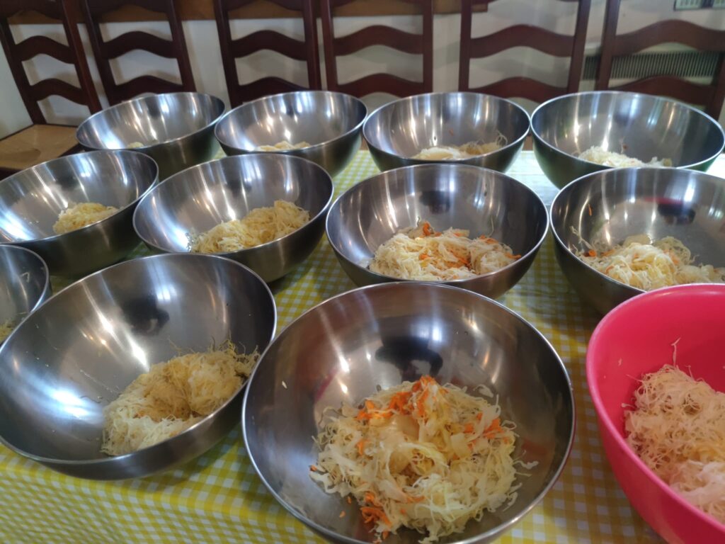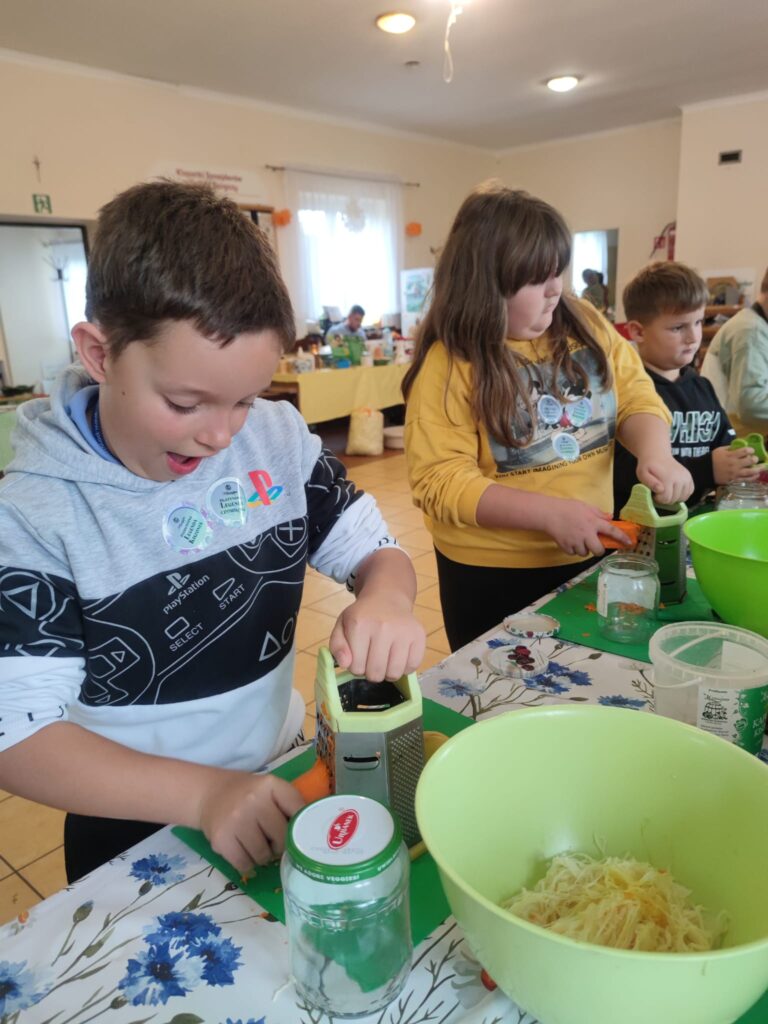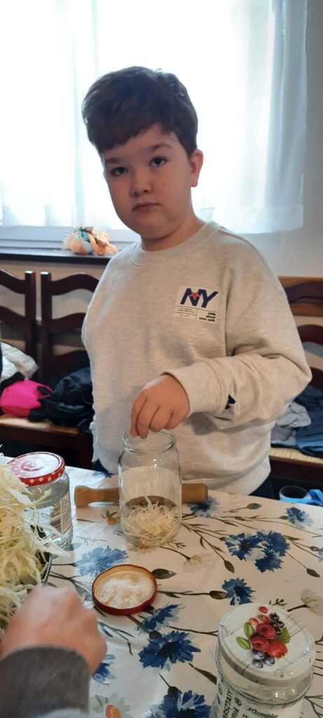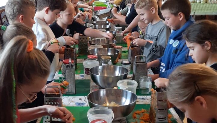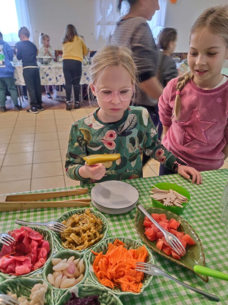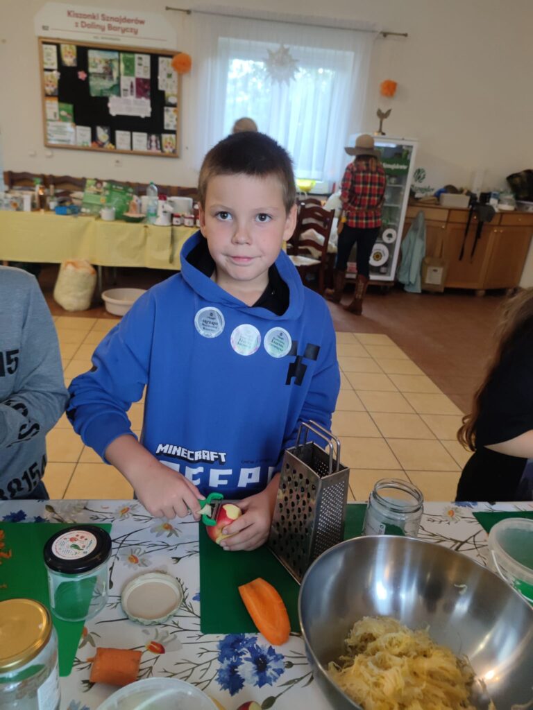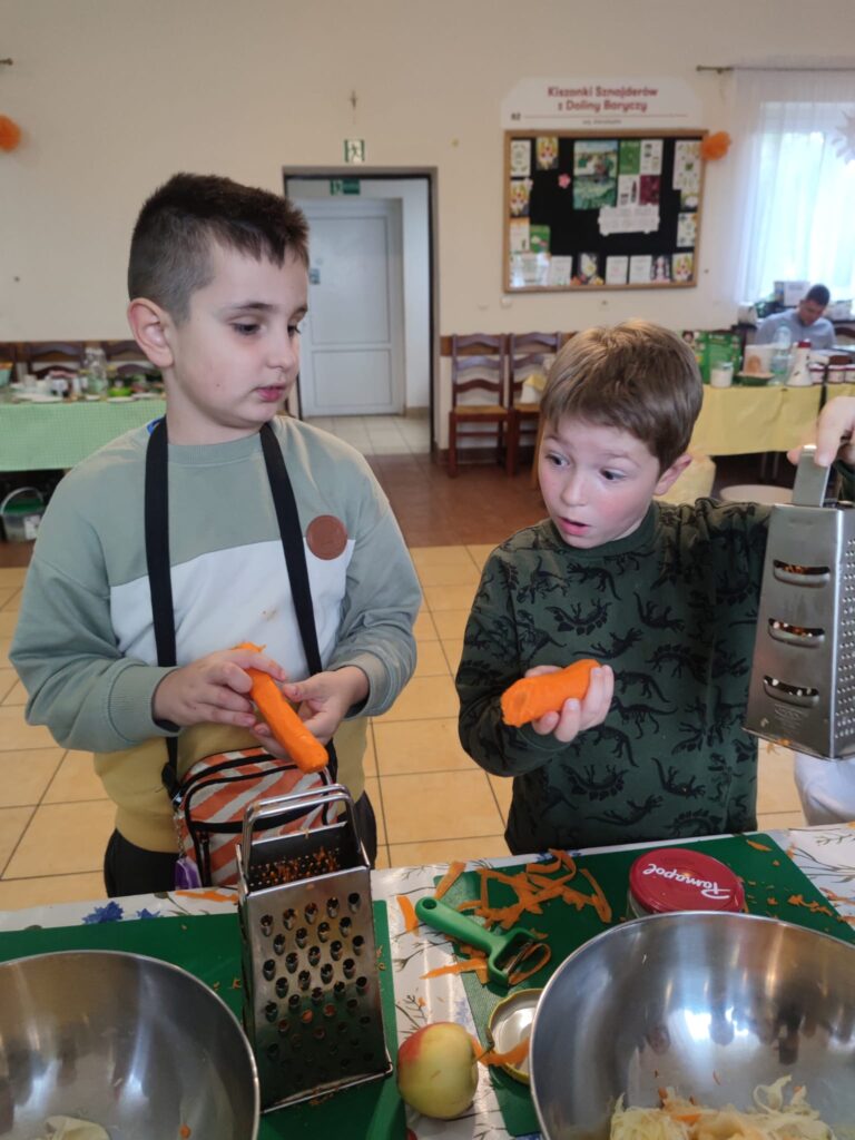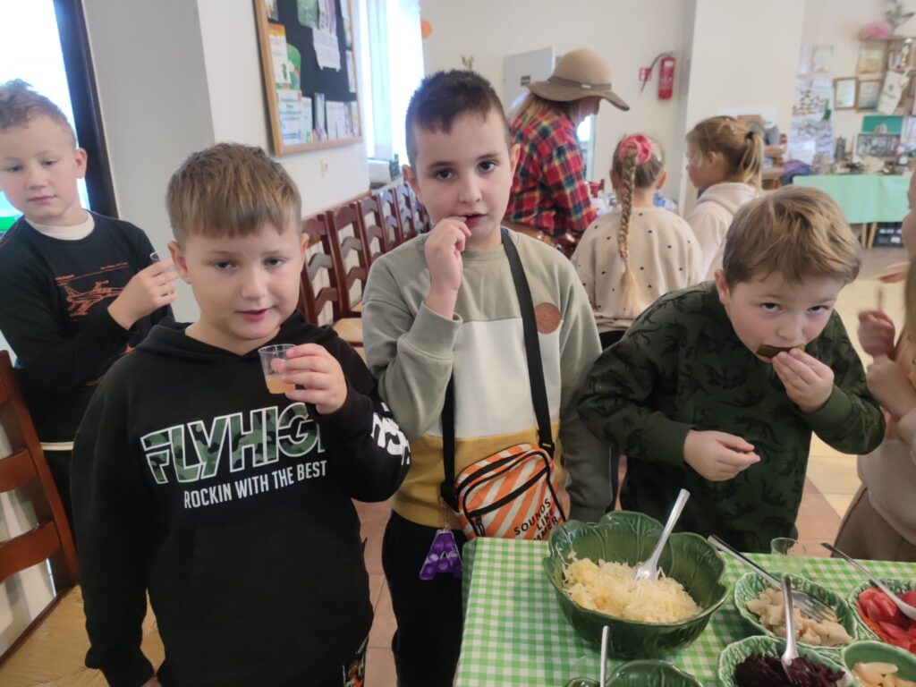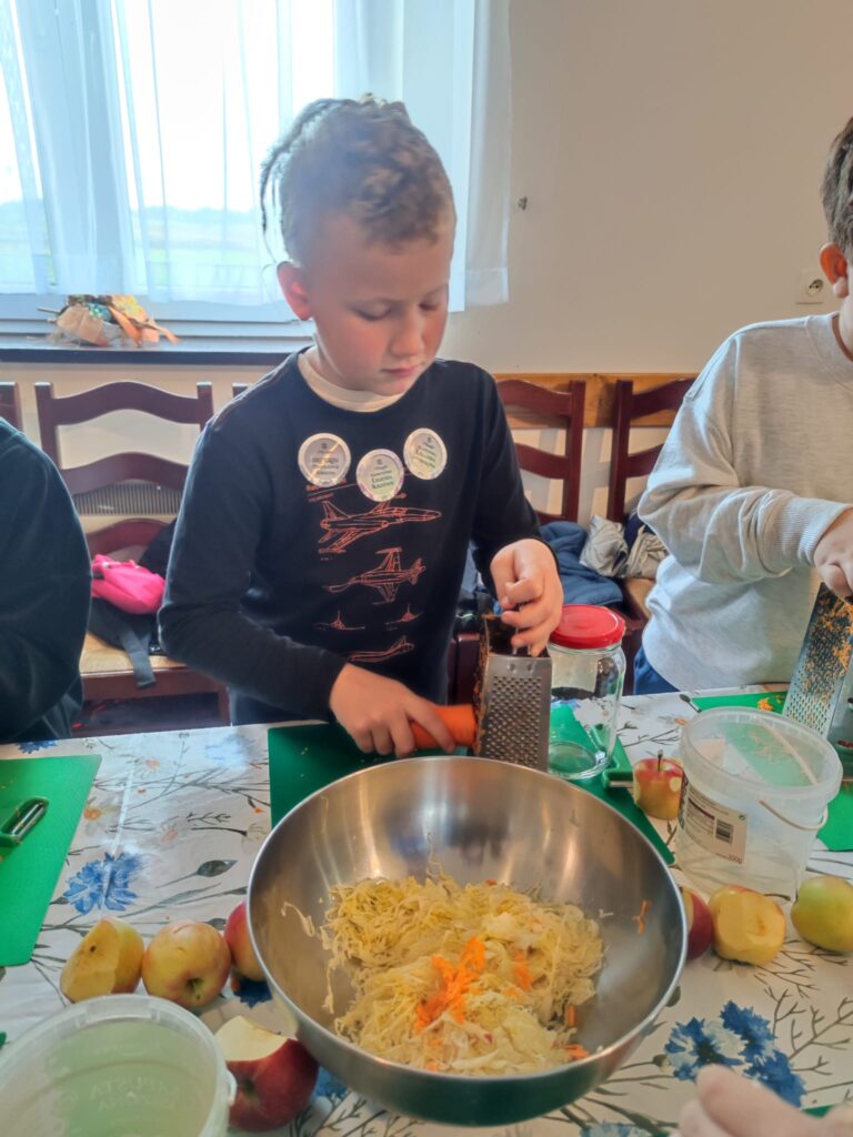 Uczniowie klas 2b i 2c uczestniczyli w niezwykłych warsztatach kiszenia kapusty u Emilii Sznajder w Karnicach. Dzieci miały okazję własnoręcznie kisić kapustę, poznając tradycyjne metody przygotowywania tego zdrowego przetworu. Degustowały również kiszone smakołyki – ogórki, rzodkiewki, czosnek, marchewkę i kalafiora – przekonując się, że zdrowe może być naprawdę pyszne!