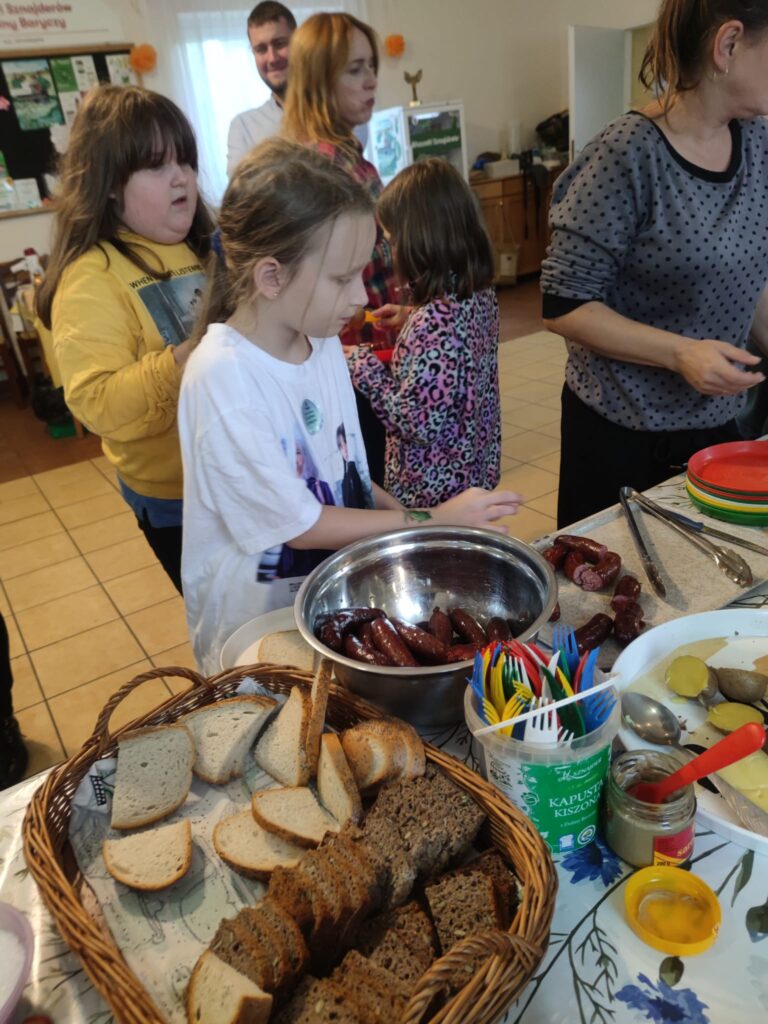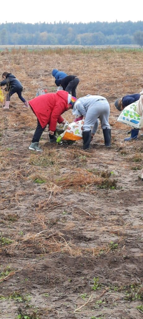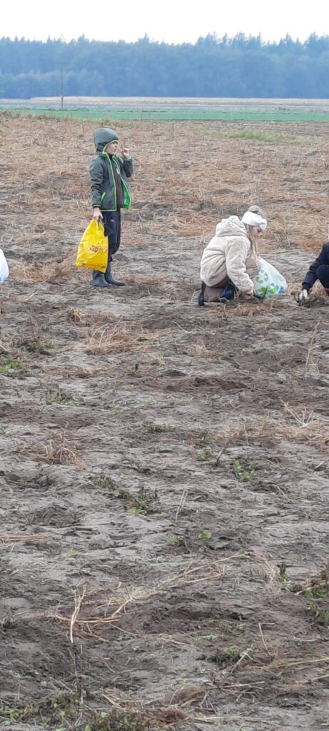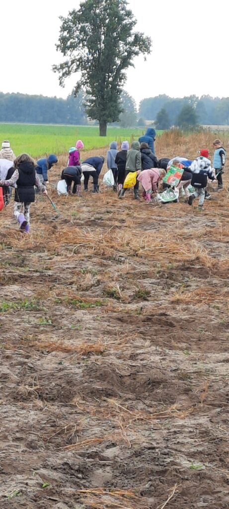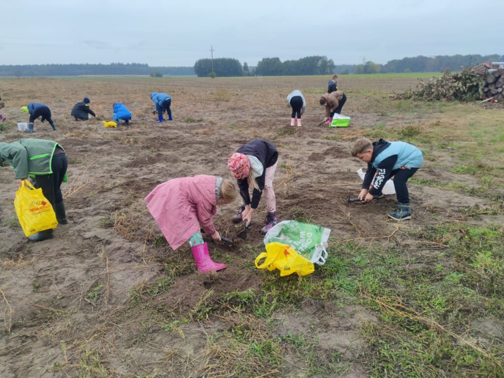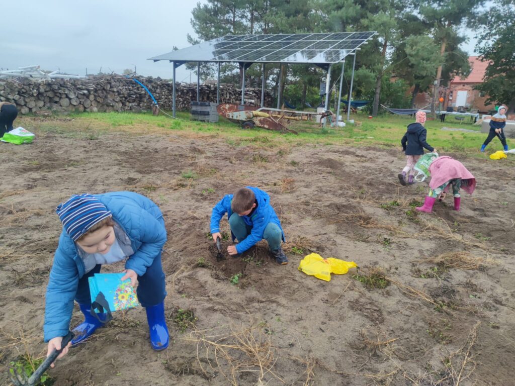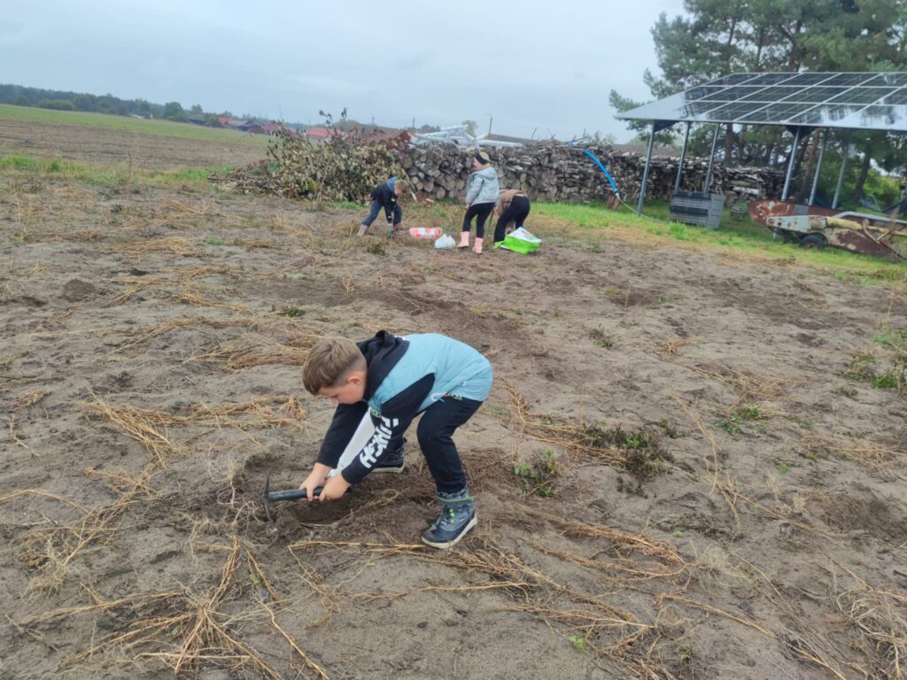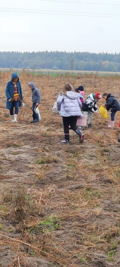 Po części warsztatowej przyszedł czas na aktywności na świeżym powietrzu. Była zabawa na placu zabaw, pieczenie kiełbasek przy ognisku, degustacja wiejskiego chleba, ziemniaków z gziką oraz innych lokalnych przysmaków. Jedną z największych atrakcji było samodzielne wykopywanie ziemniaków prosto z pola – dla wielu dzieci była to pierwsza taka przygoda!