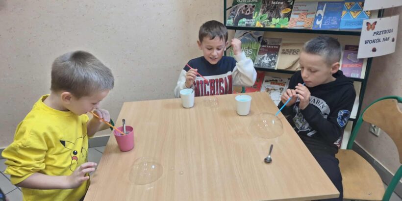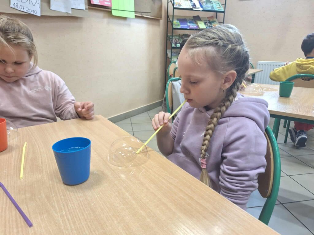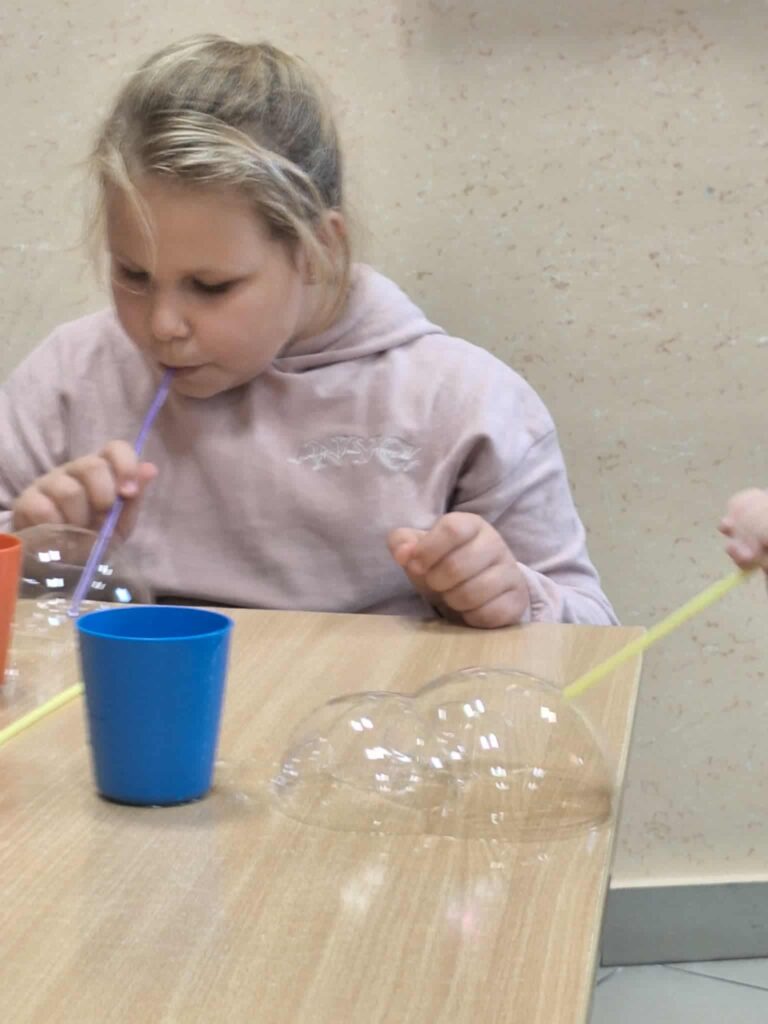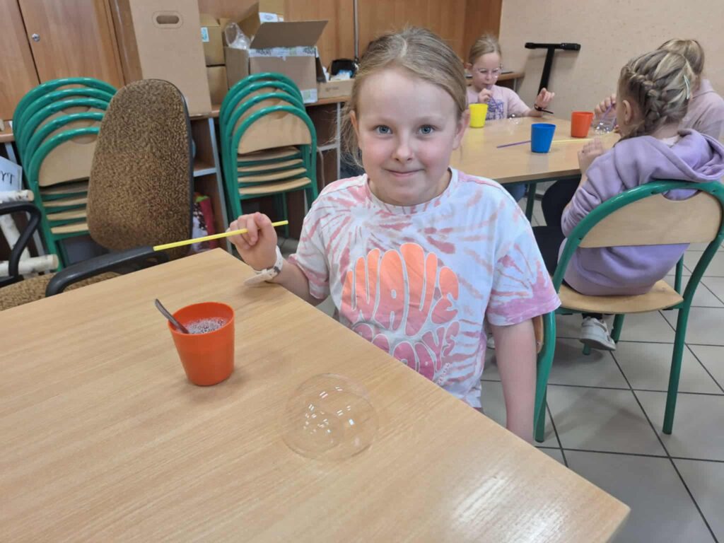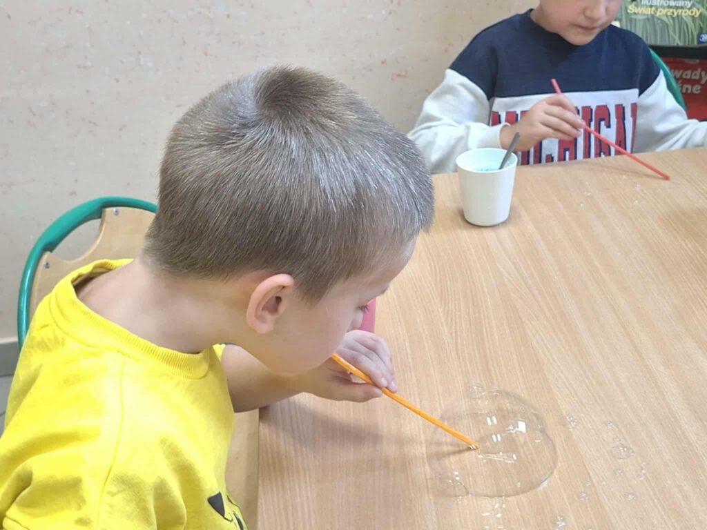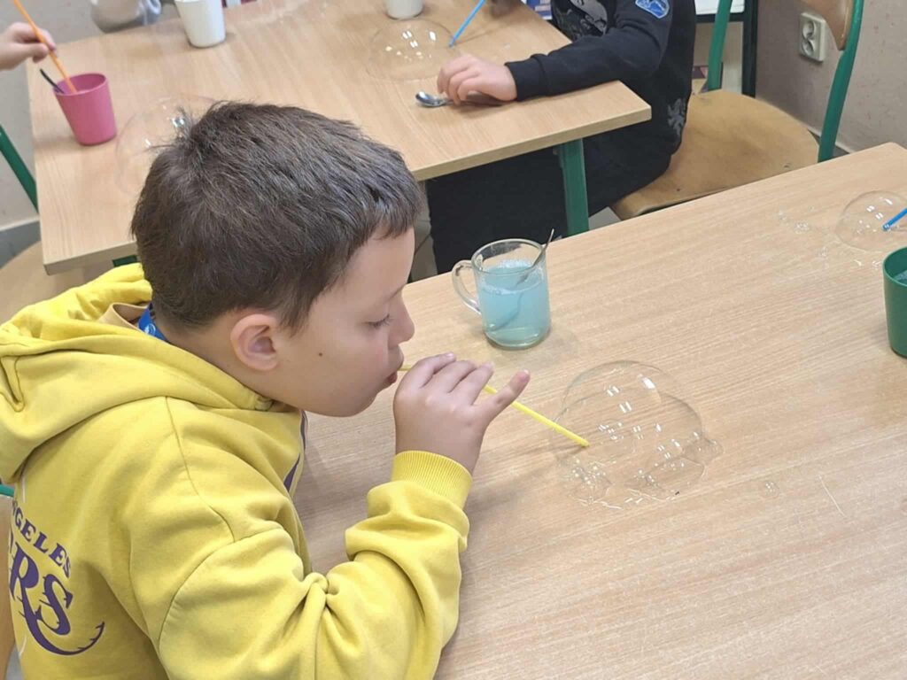 Na wtorkowym spotkaniu Koła Małych Odkrywców każdy uczestnik mógł zamienić się w prawdziwego naukowca! Wspólnie wykonywaliśmy fascynujące doświadczenie „Bańka w bańce”, poznając tajemnice napięcia powierzchniowego i obserwując, jak z pozoru zwykły płyn do zmywania potrafi tworzyć niezwykłe zjawiska. Było mnóstwo śmiechu i ciekawych obserwacji!